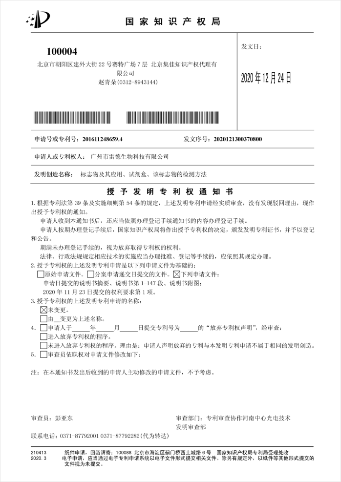 其中的一件核心技術(shù)發(fā)明專利的名稱為《標(biāo)志物及其應(yīng)用、試劑盒、該標(biāo)志物的檢測(cè)方法》,申請(qǐng)?zhí)枮椤?01611248659.4”,該發(fā)明于2020年12月24日獲得授權(quán),這也是我司首次在類風(fēng)濕關(guān)節(jié)炎(RA)血清學(xué)“標(biāo)志物”方面獲得授權(quán)的發(fā)明專利。
