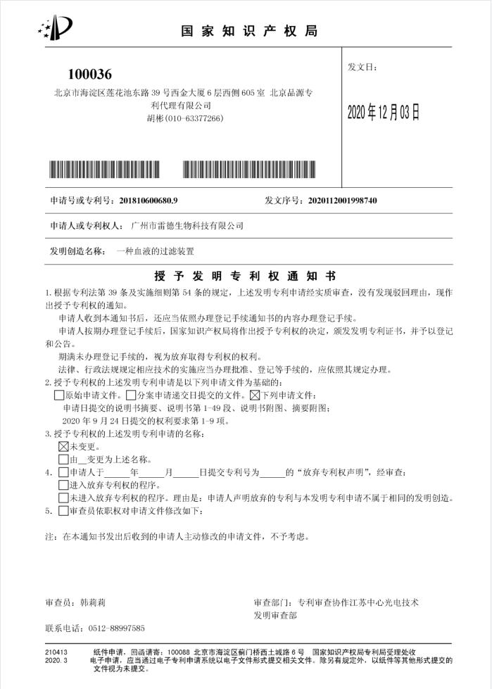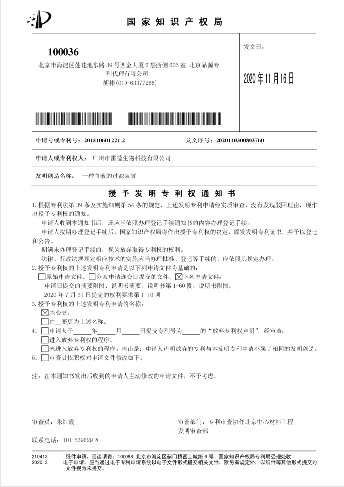 另外獲得授權(quán)的兩件核心技術(shù)發(fā)明專利名稱均為《一種血液的過(guò)濾裝置》,申請(qǐng)?zhí)枮榉謩e“201810601221.2”和“201810600680.9”,該兩件發(fā)明陸續(xù)于2020年11月16日與2020年12月03日獲得授權(quán)。
