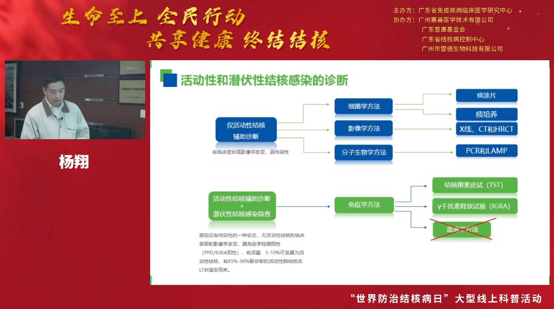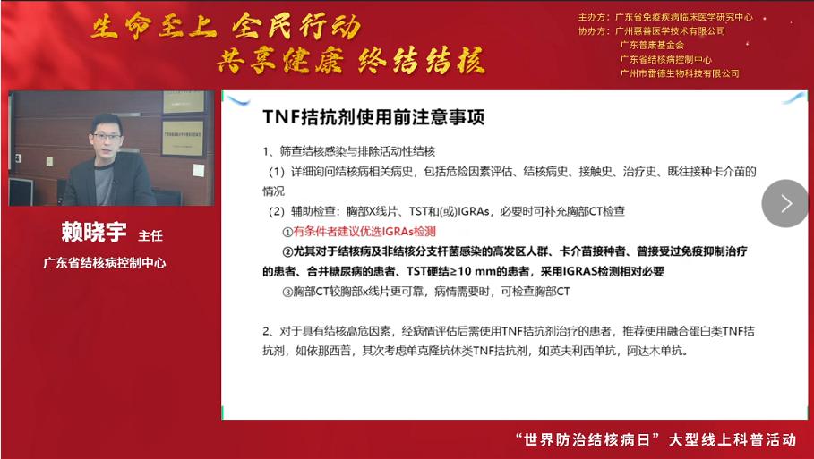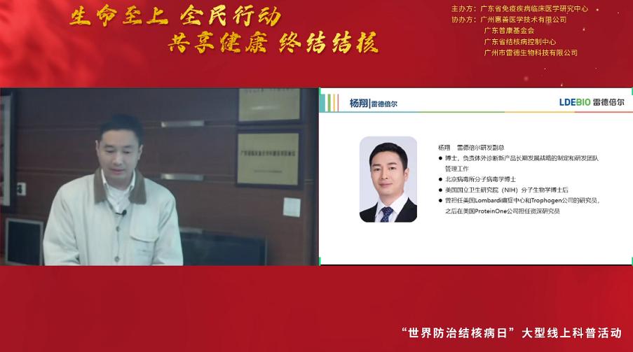 3月24日是第27個“世界防治結(jié)核病日”,今年的主題是“生命至上 全面行動 共享健康 終結(jié)結(jié)核”。為促進公眾對結(jié)核病感染危害及其檢測手段的了解,引導(dǎo)公眾做好疫情期間結(jié)核病的防控工作,2022年3月24日18:00-20:00,廣東省免疫疾病臨床醫(yī)學(xué)研究中心聯(lián)合廣東省結(jié)核病控制中心和廣州市雷德生物科技有限公司開展大型線上結(jié)核防控知識科普和結(jié)核篩查活動。