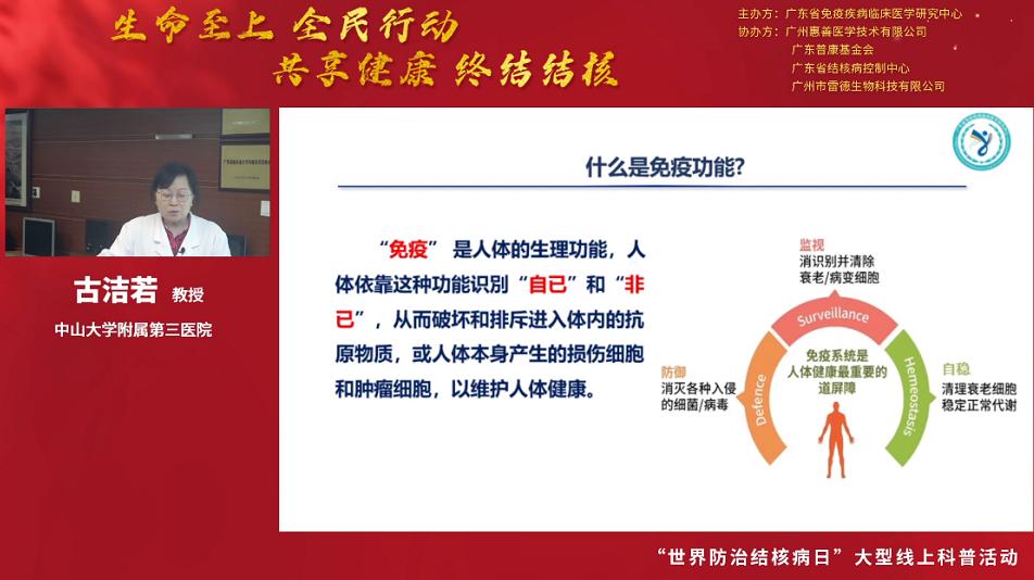 最后中山大學(xué)附屬第三醫(yī)院教授 、廣東省免疫疾病臨床醫(yī)學(xué)研究中心主任古潔若女士作了疫情期間免疫力評估意義的主題科普演講,她生動有趣地給線上聽眾講解了人體免疫功能及其免疫細(xì)胞群體,獲得線上聽眾一致點贊好評。