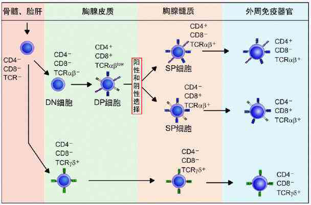 圖2  T細胞分化發(fā)育過程(圖來源網(wǎng)絡(luò))