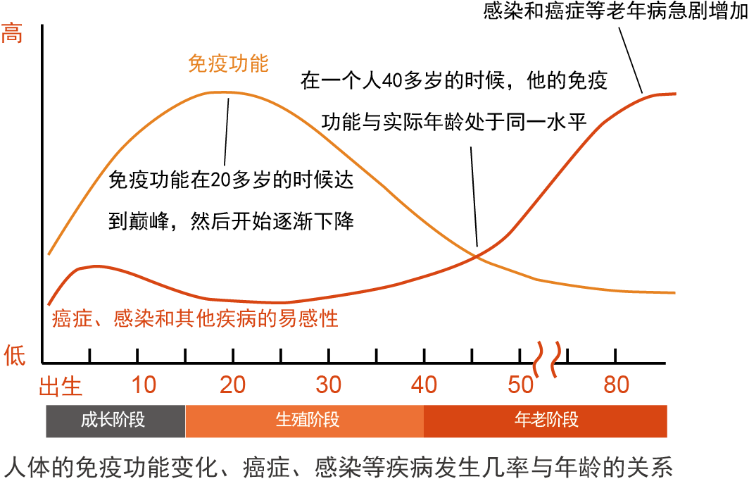 免疫衰老是各機(jī)體免疫系統(tǒng)從器官、細(xì)胞、免疫因子和調(diào)控網(wǎng)絡(luò)等方面的結(jié)構(gòu)和功能衰退,為衰老過程中最為重要的組成部分,隨著免疫衰老,我們的機(jī)體會(huì)出現(xiàn)抗感染能力下降,疫苗接種免疫效果降低,自身免疫性疾病增加,感染和癌癥發(fā)病率上升等。