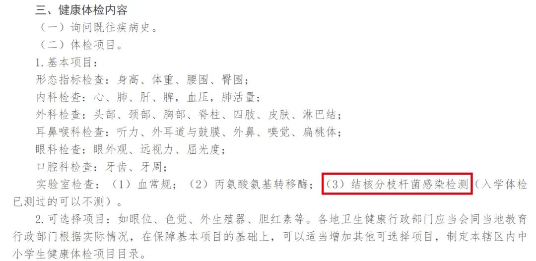 《辦法》明確規(guī)定學(xué)生健康檢查基本項(xiàng)目(也就是必檢項(xiàng)目),包括形態(tài)指標(biāo)檢查、內(nèi)科、外科、耳鼻、眼科、口腔科,以及血常規(guī)檢查、丙氨酸氨基轉(zhuǎn)移酶以及結(jié)核分枝桿菌感染檢測。可以看出,《辦法》針對結(jié)核病防控提出了更高的要求:
