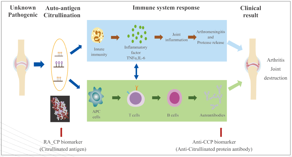 從2000年以來,除了國際公認(rèn)的RA診斷指南中CCP外,一直未有突破性的高靈敏指標(biāo)。我公司研發(fā)出最具潛力的RA血清學(xué)診斷新指標(biāo)——RA_CP(類風(fēng)濕關(guān)節(jié)炎瓜氨酸化蛋白檢測試劑盒),采用雙抗體夾心法測定人血清中瓜氨酸化類風(fēng)濕抗原,這是根據(jù)抗原-抗體的出現(xiàn)時間先后,疾病發(fā)生原理設(shè)計和臨床大量樣本驗證了的一個檢測類風(fēng)濕關(guān)節(jié)炎疾病的新指標(biāo)。RA_CP對RA的檢測靈敏度85%-95%,特異性85%-95%,對于常規(guī)CCP檢測陰性的RA患者,RA_CP仍可檢出40%-50%(截至目前的數(shù)據(jù)是超過50%)。在CCP陰性患者中使用RA_CP可提高RA患者檢出率,提高臨床診斷類風(fēng)濕性關(guān)節(jié)炎的準(zhǔn)確性,顯著降低臨床漏診發(fā)生率,開展RA_CP檢測項目在臨床上可以更好地輔助RA診斷。